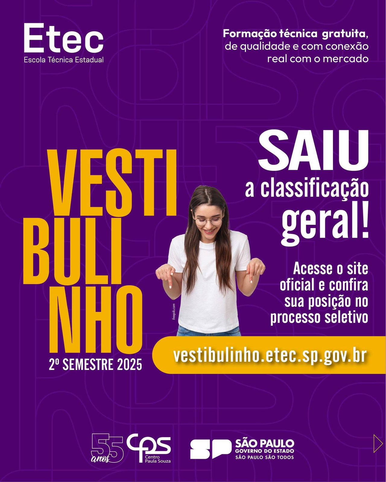 A classificação geral do processo seletivo das Etecs está disponível para consulta no site https://vestibulinho.etec.sp.gov.br/